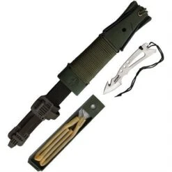 - Outside of sheath features several feet of OD green nylon cord, black coated stainless metal arms at tip of sheath that flip out to serve as slingshot