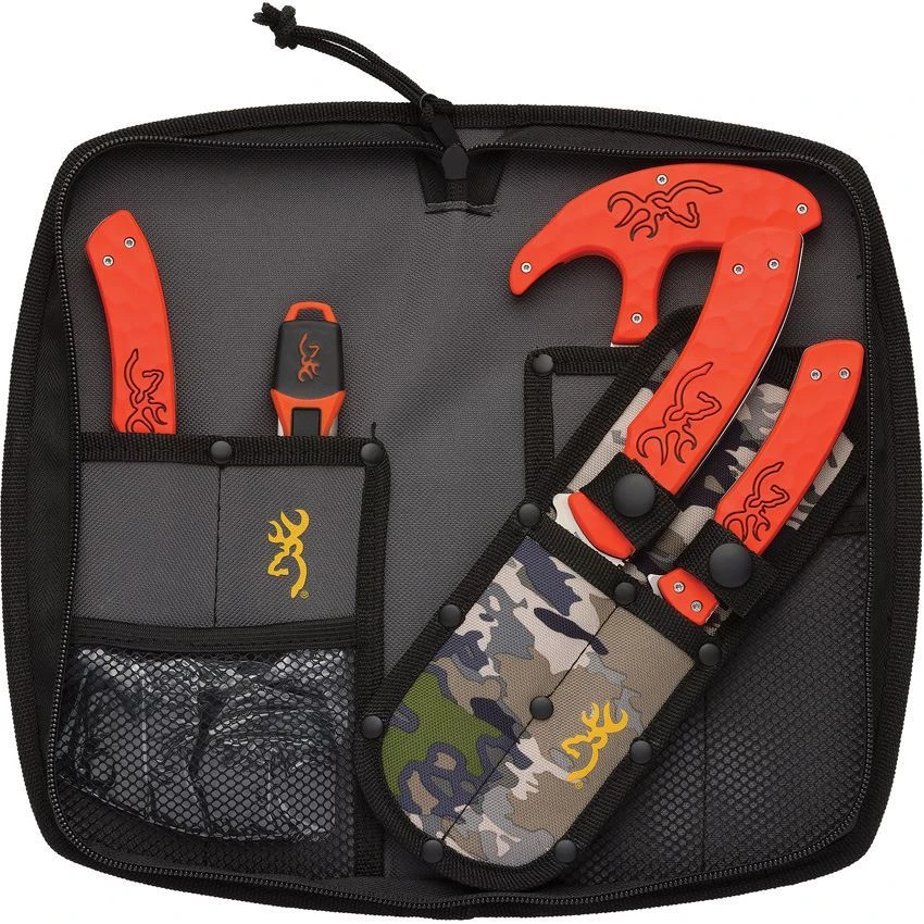 Model/Part Number – BR0482B. Browning Knives Primal Series 6pc Game Set. Satin finish 8Cr13MoV stainless blade. Orange rubberized polymer handle. Includes: 9.25″ overall bone saw with 6.5″ serrated blade; 8.88″ overall skinner with 3.88″ blade; 8″ overall caper with 3.63″ blade; 7.5″ overall gut tool with 3.13″ blade. Sharpening tool; Disposable pair Nitrile gloves; Nylon storage case. Boxed. Made in China.