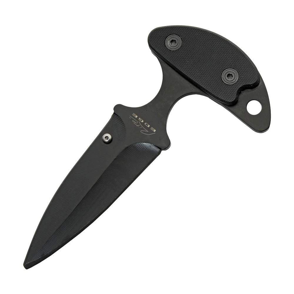 Model – CN211550. China Made Tactical Neck Knife. 5.5″ (13.97cm) overall. 3.25″ (8.26cm) black finish stainless blade. Black G10 handle. Full, extended tang. Lanyard hole. Metal belt clip. Cord lanyard. Black molded plastic belt sheath. Boxed. Made in China.