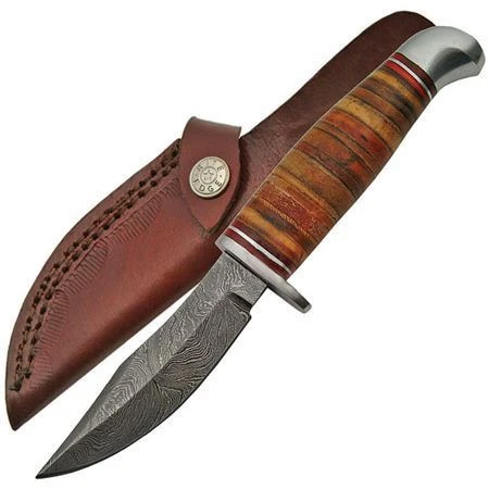 Model – DM1166. Stacked Leather Skinner. 7.75 inch overall. 3.5 inch Damascus steel clip point blade. Stacked leather handle. Aluminum guard and aluminum pommel. Brown leather belt sheath. Boxed.