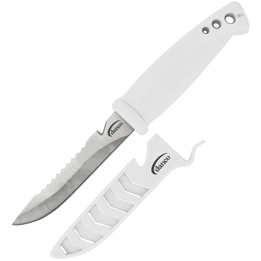 Model -DNC03746. Deluxe Bait Knife. 8.25 inch (20.96cm) overall. 4 inch (10.16cm) sawback stainless blade. White plastic handle. EZ line cutter on reverse side of blade. Locking ported sheath. Clam packed. Made in China.