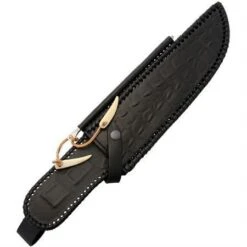 Model – DUKCDE. Outback Eclipse. 16 inch overall. 11 inch satin finish 1095HC steel blade. Black stacked leather handle. Brass guard and pommel. Black leather sheath with sharpener. Boxed.