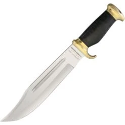Model – DUKCDE. Outback Eclipse. 16 inch overall. 11 inch satin finish 1095HC steel blade. Black stacked leather handle. Brass guard and pommel. Black leather sheath with sharpener. Boxed.