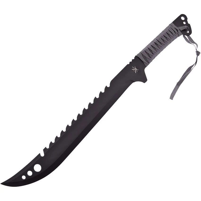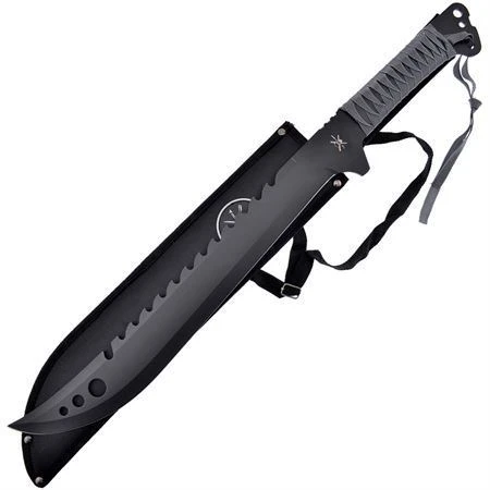 Model – FTR2632BLK. Machete Gray Wrap. Tac Xtreme. 25 inch overall. 16 inch black finish sawback stainless blade. Gray cord wrapped handle. Full, extended tang. Lanyard hole. Black nylon belt sheath with shoulder strap. Boxed.