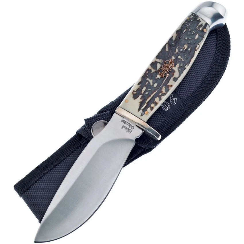 Model -FSW601SBR. Trapper Skinner. Steel Warrior. 8.5 inch (21.59cm) overall. 4.25 inch (10.8cm) satin finish stainless skinner blade. Stag bone resin handle. Nickel silver guard and aluminum pommel. Inlay shield. Black nylon belt sheath. Boxed. Made in China.