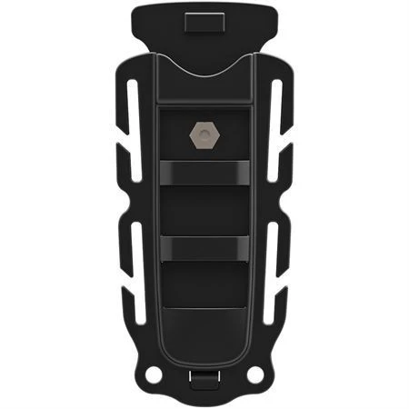 - Black nylon belt sheath with removable clip, quick release, webbing mounts, and quick drain