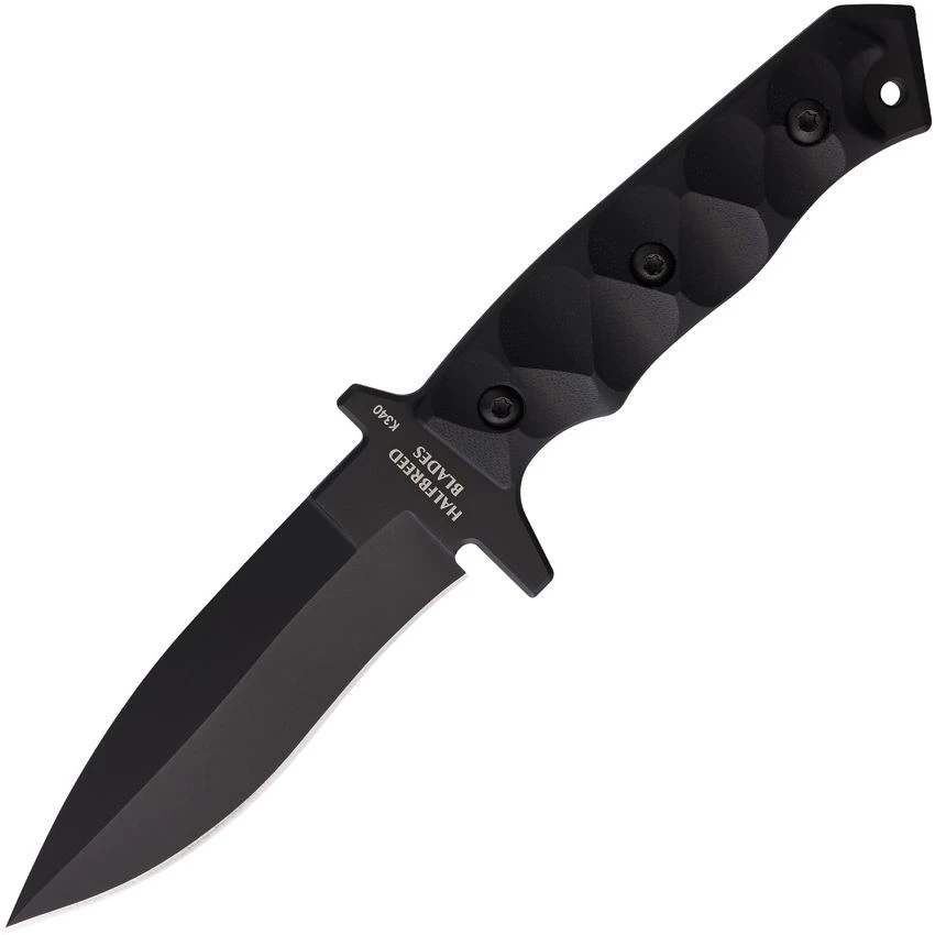 Model – HBBMCK01. Halfbreed Medium Clearance Knife. 9.25″ (23.5cm) overall. 4.5″ (11.43cm) black Teflon coated Bohler K110 stainless spear point blade. Black G10 handle. Lanyard hole. Full, extended tang. Black Kydex belt sheath. Boxed. Made in Australia.
