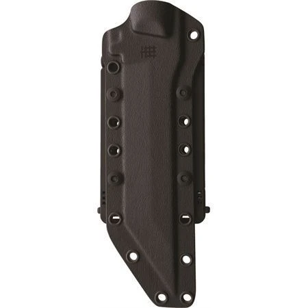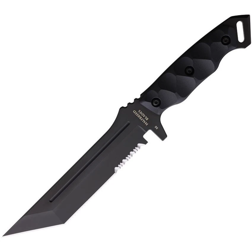 Model – HBBMIK05. Halfbreed MIK05 – Medium Infantry Knife. 11.75″ (29.85cm) overall. 6.75″ (17.15cm) black Teflon coated partially serrated Bohler K110 stainless tanto blade. Black G10 handle. Full, extended tang. Lanyard hole. Black Kydex MOLLE compatible belt sheath. Boxed. Made in Australia.
