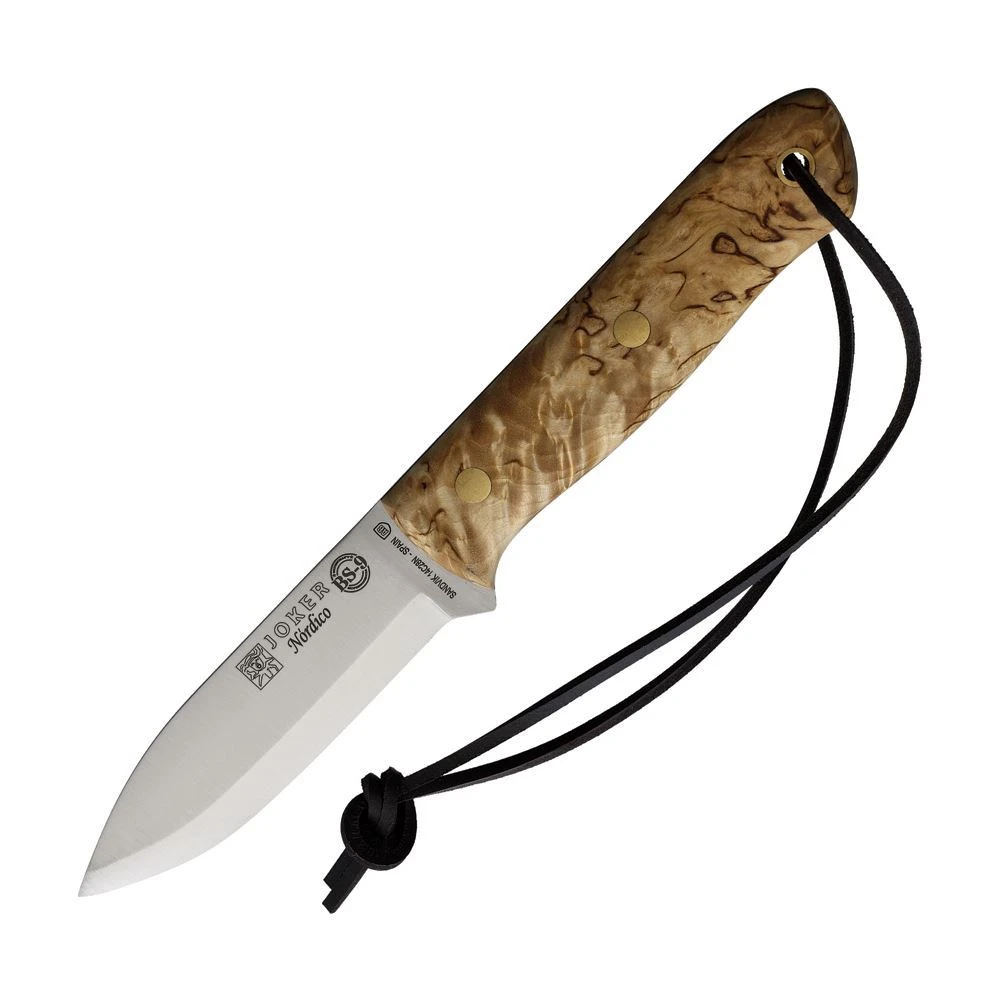 Model – JKRCL115. Joker Nordico Fixed Blade Birch. 8.75″ (22.23cm) overall. 4″ (10.16cm) satin finish 14C28N Sandvik stainless blade. Curly Birch handle. Full tang. Lanyard hole. Brown leather belt sheath. Boxed. Made in Spain.