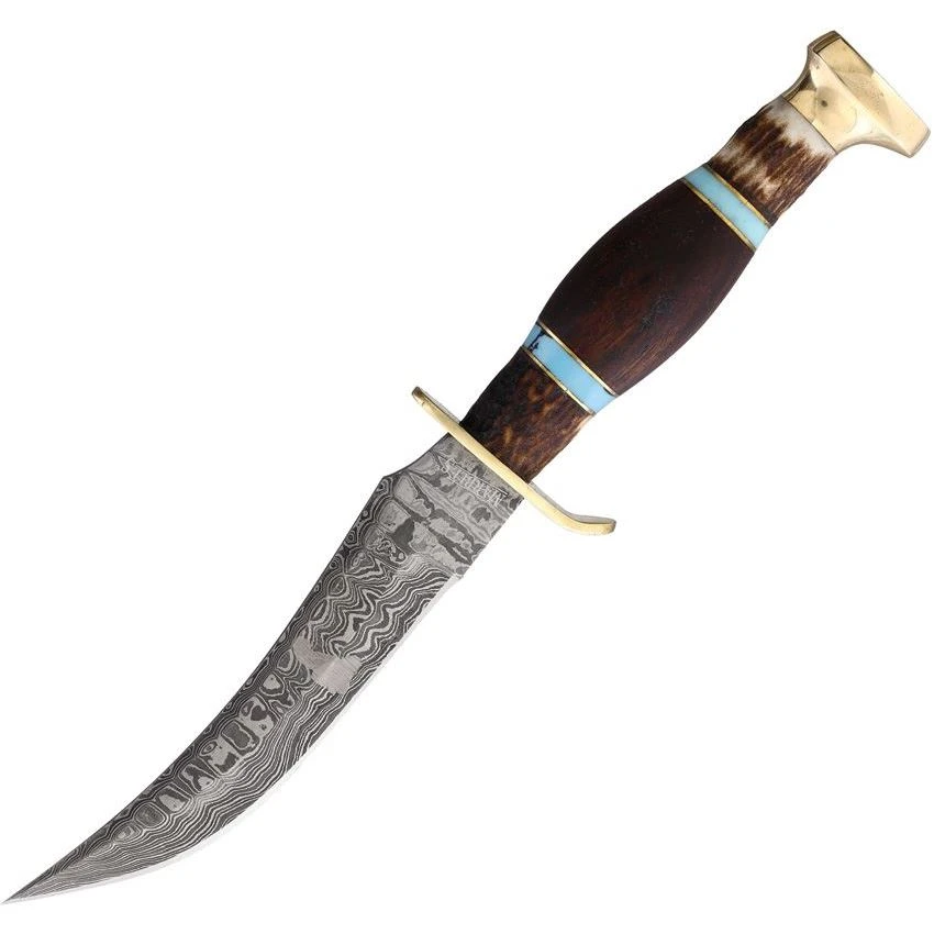 Model – MR490D. Marbles Skinner Wood/Stag Damascus. 10″ (25.4cm) overall. 5.5″ (13.97cm) Damascus steel skinner blade. Brass guard and pommel. Brown wood, stag bone, and blue stone handle. Brown leather belt sheath. Boxed. Made in Pakistan.