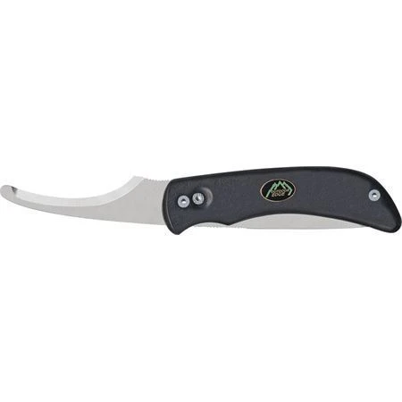 Model – OE10N. Swing Fixed Blade Knife. 8.38 inch overall. AUS-8 stainless interchangeable drop point skinner and guthook blades. Simply push the lock button to change the blade. Black rubberized Kraton handles. Black nylon belt sheath. The SwingBlade is an international knife combining the design efforts of Outdoor Edge president David Bloch, EKA Knives of Sweden (founded in 1882) and professional Swedish hunter Thomas Ekberg. Made in China.