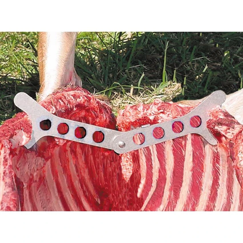 - Pivoting steel bar to spread the brisket open for easier field dressing and cooling of fresh game meat