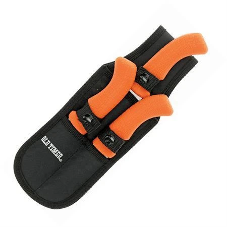 Model – SCHP1105592. Old Timer Hunt Pack. Satin finish stainless blade. Orange rubberized polymer handle. Includes: 8 inch overall guthook with 3.5 inch blade; 7.5 inch overall hunter with 3.25 inch blade; 9.75 inch overall fillet with 5.25 inch blade; 2 inch overall sharpener. Black nylon belt sheath. Clam packed.