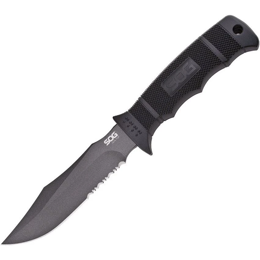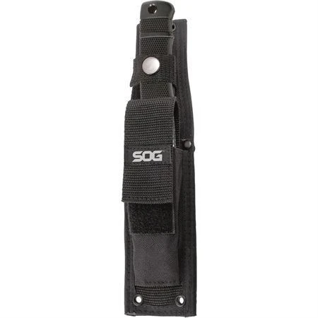 Model – SOGM37NCP. SOG M37NCP – Seal Pup with Nylon Sheath. 9″ overall. 4 3/4″ gray powder coated AUS-8 stainless partially serrated blade. Black glass reinforced Zytel handle with finger grooves and scored with grip lines. Lanyard hole. Black MOLLE compatible nylon belt sheath. Made in Taiwan.